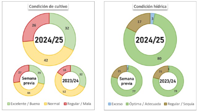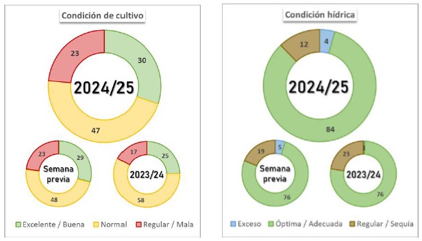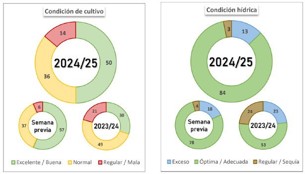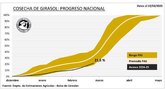 A su vez, la cosecha de girasol ya cubre el 21,6 % del área apta, luego de un progreso intersemanal de 4 p.p. Como consecuencia de las lluvias mencionadas, no solo se acentúan las demoras respecto al ciclo previo y al promedio U5C por falta de piso para la entrada de las máquinas (-21,2 y -34 p.p., respectivamente), sino que además se registraron inconvenientes referidos a brotado de granos y aumento de la incidencia del complejo de enfermedades que provocan vuelco de plantas y podredumbre de capítulos. Sin embargo, en las zonas quebradas del sur del área agrícola, las labores pudieron avanzar sobre las lomas con resultados alentadores, y al mismo tiempo se espera la adecuación del terreno en los bajos para continuar con la recolección. De mediar condiciones favorables durante las próximas semanas, podrán completarse las evaluaciones de los daños ocasionados por el temporal y retomar la cosecha.