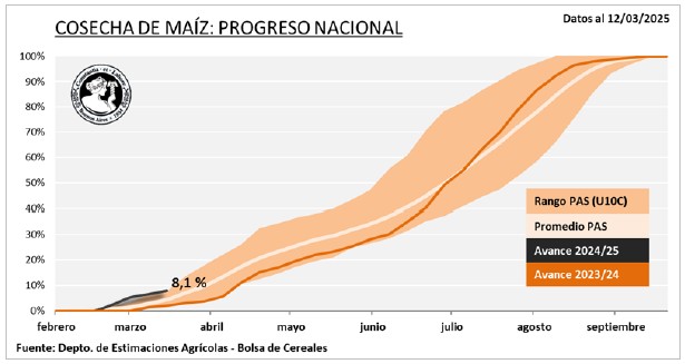 A la fecha, la cosecha cubre el 8,1 % del total estimado, erogando un rinde medio de 78,8 qq/Ha. Las lluvias han mejorado sustancialmente la condición del maíz tardío, aunque algunas zonas han sufrido anegamientos.