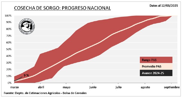La cosecha ha avanzado lentamente producto de las lluvias registradas en buena parte de la región central, reportando un rinde medio de 36,1 qq/Ha. La zona núcleo sorguera continúa con mermas productivas debido a la falta de lluvias.