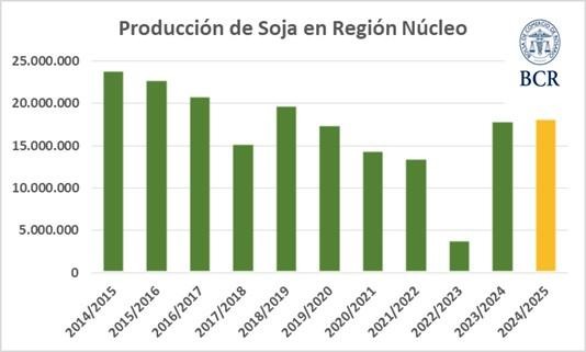 Hace un mes atrás se esperaba una producción de soja de 16,5 Mt en la región núcleo. A pesar de que la sequía y la intensa ola de calor en enero dejaron pérdidas irreversibles en el cultivo, la recuperación tras lluvias permitió contar con reservas de agua para el llenado de granos de soja de primera y para el periodo crítico de la de segunda. De esta manera, la mejora del rendimiento respecto hace un mes atrás es de 4 quintales y ahora se estiman 36 qq/ha. Por lo tanto, la región producirá 1,7 Mt más, totalizando una cosecha de 18,2 Mt. El ciclo de soja 2024/25 queda con una producción de 200.000 tn más que el año pasado, pero quedará debajo del del horizonte productivo que se tenía a la siembra con un clima normal y que permitía anticipar 19,2 Mt.