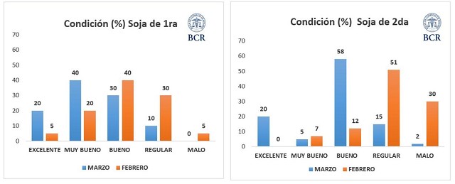 La soja de primera también mostró mejoras allí: hace un mes, el 50% de los lotes estaban entre regular y mal estado, pero hoy los cuadros en malas condiciones desaparecieron y al igual que la soja de segunda, un 20% persiste en estado regular.