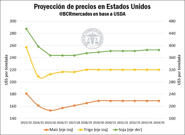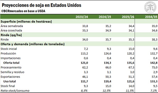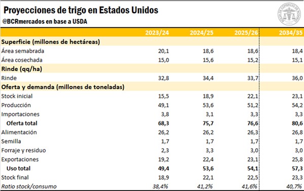 Finalmente, por el lado del trigo, luego del enorme crecimiento registrado en la producción del cereal norteamericano en 2024/25, la misma caería un 4% durante la próxima campaña, para situarse en 51,2 Mt, como consecuencia de menores rindes. No obstante, durante la próxima década, se registraría un leve incremento del 1% en la cosecha de trigo, que alcanzaría 54,2 Mt hacia la campaña 2034/35. Esta mayor producción respondería a mejores rindes, que compensarían la menor área sembrada.
