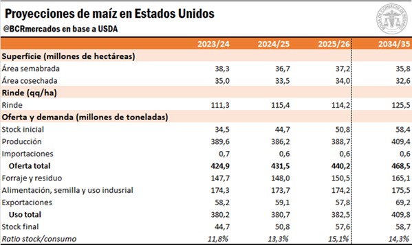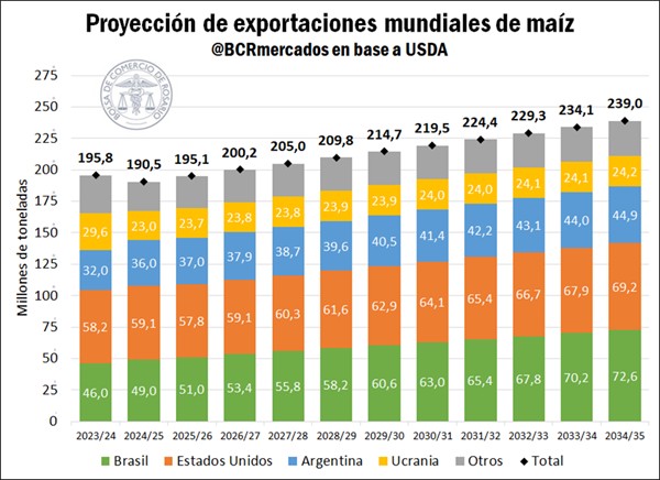 A nivel internacional, la agencia norteamericana espera que la producción mundial de maíz aumente casi un 14% durante el periodo la próxima década, alcanzando los 1.439 Mt en 2034/35. Estados Unidos y China serían responsables de más de la mitad de la producción mundial del cereal (51%), en tanto le seguirían Brasil, la Unión Europea y Argentina. De estos países, Brasil registraría los mayores incrementos en la producción durante el período de proyección, creciendo 52 Mt entre 2025/26 y 2034/35.