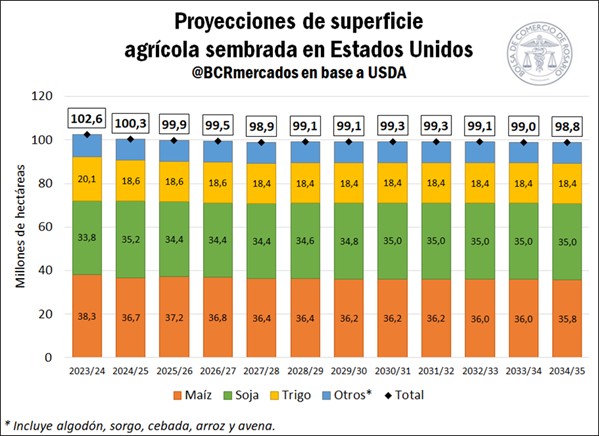 Mirando hacia adelante, el organismo gubernamental estadounidense prevé que el área implantada con los principales ocho cultivos disminuya en 0,4 millones de hectáreas en 2025, en tanto estima que la tendencia decreciente se mantenga año a año, de manera que el área sembrada se situaría en 98,8 millones de hectáreas en 2034. Así, estos commodities ocuparían en total un 2% menos de superficie respecto a 2024 y 5% menos respecto a 2014. En este sentido, las proyecciones del USDA para el 2034 son de 35,8 millones de hectáreas de maíz (↓2% respecto a 2024), 35 millones de hectáreas de soja (↓1% respecto a 2024), 18,4 millones de hectáreas de trigo (↓1% respecto a 2024), y 9,6 millones del resto de los cultivos (↓1% respecto a 2024). De efectivizarse estas previsiones, el maíz perdería 1 p.p. de participación en la superficie agrícola estadounidense en la próxima década, pasando del 37% al 36%, en manos de la soja y el trigo, que alcanzarían una participación del 35% y 19%, respectivamente.