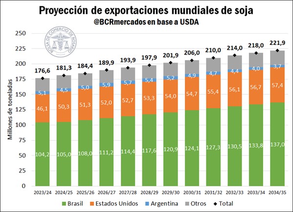 Se prevé que Brasil suministre la mayor parte de esas exportaciones, con una cuota de casi el 62% del total de las exportaciones mundiales en 2034/35, seguido de Estados Unidos y Argentina. No obstante, el USDA destaca que, en Argentina, la actual política que aplica una alícuota de retenciones más alta a la exportación de poroto de soja que de derivados incentiva la molienda y exportación de aceite y harina de soja. Como consecuencia, se estima que las exportaciones de poroto disminuirán en torno al 18% hasta 3,7 Mt en 2034/35, de manera que Argentina seguiría ocupando el tercer lugar como exportador de soja, pero muy alejado de Brasil y Estados Unidos. Como contracara, las ventas externas argentinas de aceite de soja y harina de soja crecerían 22% y 16%, respectivamente, logrando que nuestro país se mantenga como líder indiscutido en la exportación de estos subproductos.