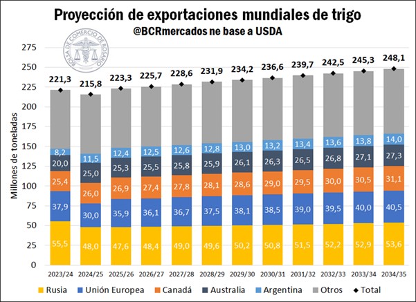 En cuanto a las exportaciones, se estima que los mayores ocho exportadores del cereal, esto es, Rusia, la Unión Europea, Canadá, Australia, Estados Unidos, Ucrania, Argentina y Kazajstán, darán cuenta del 90% de las ventas externas de trigo en 2034/35. Respecto a Argentina, se prevé que las exportaciones crezcan de 11,5 Mt en 2024/25 a 14 Mt en 2034/35. Si bien Brasil suele absorber cerca de la mitad de las exportaciones argentinas del cereal, se prevé que las importaciones brasileras de trigo argentino aumenten lentamente durante la próxima década, dada la expansión de la producción de trigo en nuestro país limítrofe. De esta manera, la mayor parte del crecimiento de las exportaciones argentinas se dirigirán a África y el sudeste asiático.