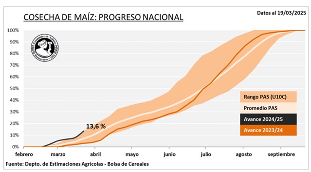 La cosecha tomo impulso luego de las lluvias avanzando 5,5 p.p. intersemanal. Con un rinde cosechado de 82,7 qq/Ha, se ha recolectado el 13,6 % a nivel nacional. Mantenemos nuestra proyección en 49 MTn.