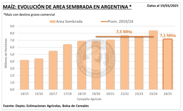 Por su parte, la cosecha de maíz grano comercial ha tomado impulso desde nuestro informe previo tras el paso de los últimos frentes de tormenta. Hasta el momento, se ha recolectado el 13,6 % del total nacional estimado, lo que significa un avance intersemanal de 5,5 p.p., con un rendimiento promedio de 82,7 qq/Ha. En la zona norte del área agrícola, la falta de lluvias que predominó a lo largo de gran parte de la campaña gruesa ha generado una caída del 40 % en los rendimientos esperados en comparación con la estimación previa. De manera similar, aunque con menor impacto, regiones del centro y norte de Córdoba, el norte de Santa Fe y el sur del área agrícola también registraron períodos de déficit hídrico que generaron mermas principalmente en los planteos tardíos, reduciendo su potencial de rendimiento entre un 6 % y un 15 %, según la zona. Las lluvias que llegaron en febrero permitieron que esa merma no sea mayor en las regiones mencionadas. No obstante, se ha realizado un ajuste al alza en el área implantada del ciclo anterior (2023/24) llevándola a 8,4 MHa que, consecuentemente genera un incremento de la producción de dicha campaña, ubicándola en 51,6 MTn. Como resultado, la superficie estimada para la campaña en curso (2024/25) se eleva a 7,1 MHa. A pesar de las pérdidas de rendimiento registradas, esta nueva proyección del área sembrada permite mantener la proyección de producción actual de 49 MTn.