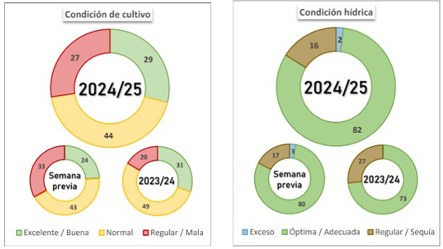 La cosecha marcó un progreso intersemanal de 17,7 p.p., cubriendo el 39,3 % del área apta. El rendimiento medio asciende a 23,8 qq/Ha. La proyección nacional de producción sube a 4,3 MTn.