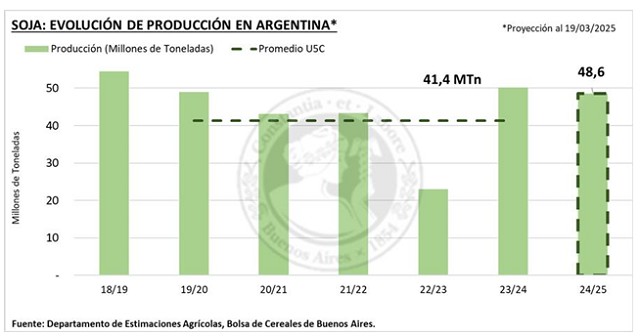 Por el contrario, lluvias registradas entre fines de febrero y principios de marzo en el centro de la región agrícola han impactado de manera favorable tanto en los planteos de primera como en las sojas de segunda. En los primeros favoreciendo el llenando grano, mientras que en los de segunda a partir de la formación de vainas. Esta situación ha superado nuestra proyección inicial de rendimiento para la región central, si bien no logra compensar la caída en el norte del área agrícola, ha evitado una mayor disminución de producción. Bajo este contexto, se ha reducido nuestra proyección de producción en 1 MTn, llegando a 48,6 MTn.