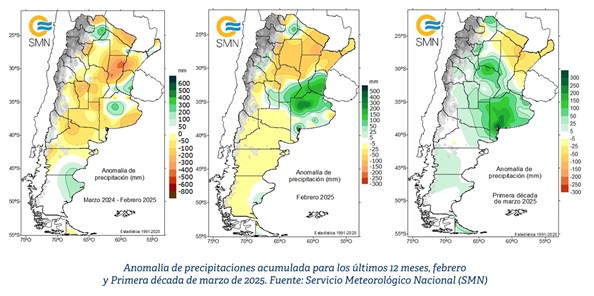 En un escenario hídrico diametralmente opuesto se encuentra el centro y sur de la región pampeana, donde, luego de atravesar una intensa sequía durante gran parte del verano, las lluvias ocurridas entre finales de febrero y primeros días de marzo superaron ampliamente los registros medios. La ciudad de Bahía Blanca y localidades aledañas han sido tristemente el epicentro de esta catástrofe, donde se registraron cerca de 300 mm de lluvias en 12 horas, tres veces más de lo que suele llover en todo el mes. En este marco, gran parte del centro y sur de la provincia de Buenos Aires y zonas linderas de La Pampa derivaron en una clara situación de exceso hídrico, la cual según un relevamiento realizado por CARBAP al 10 de marzo, comprometía cerca de 2 millones de hectáreas en 13 partidos bonaerenses.