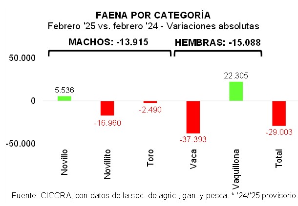 En el caso de la faena de hembras, el total faenado disminuyó 3,0% anual, totalizando 482,14 mil cabezas (-15,09 mil cabezas). Dado que la contracción fue mayor a la de los machos, la importancia de las hembras en la faena total cayó a 47,0%, ubicándose 0,15 puntos porcentuales por debajo de febrero de 2024. No obstante lo cual, cabe destacar el sostenimiento de esta ratio por encima del límite superior compatible con el mantenimiento del rodeo vacuno (45%). Y también hay que resaltar la persistente ganancia de participación de las vaquillonas en la faena de hembras. En comparación con febrero de 2024, la faena de vaquillonas creció 7,7% y se ubicó en 313,87 mil cabezas (+22,3 mil cabezas). Esto hizo que su importancia en la faena total llegara 30,6% (+3,0 puntos porcentuales). A la inversa, la faena de vacas cayó 18,2% anual, hasta totalizar 168,27 mil cabezas (-37,39 mil cabezas).