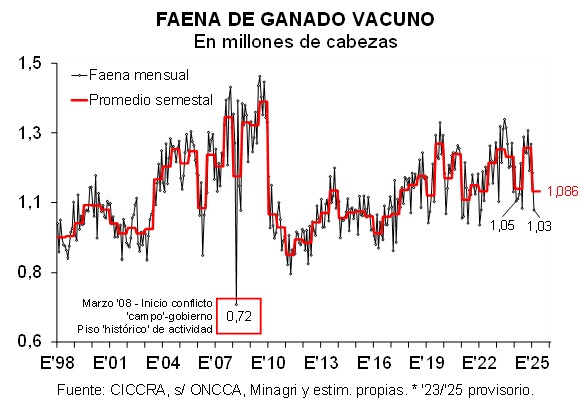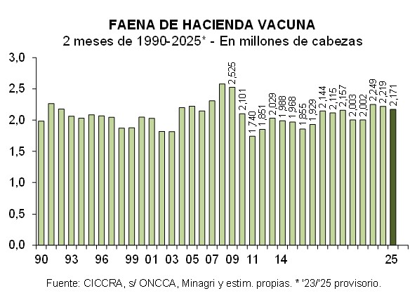 Al considerar el primer bimestre de 2025, un total de 348 establecimientos faenó 2,171 millones de cabezas de hacienda vacuna. En términos interanuales se verificó una contracción de 2,2% (-48,3 mil cabezas).
