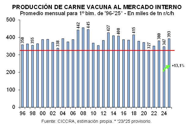 En el primer bimestre de 2025 la producción de carne vacuna fue equivalente a 499 mil tn r/c/h, ubicándose 1,7% por debajo de la producción registrada en el mismo bimestre de 2024. En términos absolutos, la cantidad ofrecida de carne vacuna se redujo en 8,5 mil tn r/c/h con relación a un año atrás.