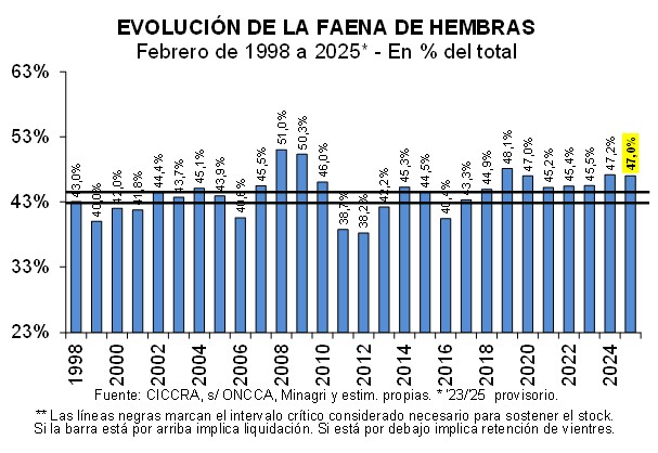 En el caso de la faena de hembras, el total faenado disminuyó 3,0% anual, totalizando 482,14 mil cabezas. Dado que la contracción fue mayor a la de los machos, la importancia de las hembras en la faena total cayó a 47,0%, ubicándose 0,15 puntos porcentuales por debajo de febrero de 2024. No obstante lo cual, cabe destacar el sostenimiento de esta ratio por encima del límite superior compatible con el mantenimiento del rodeo vacuno (45%). Y también hay que resaltar la persistente ganancia de participación de las vaquillonas en la faena de hembras. En comparación con febrero de 2024, la faena de vaquillonas creció 7,7% y se ubicó en 313,87 mil cabezas.