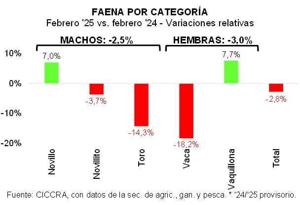 En total se faenaron 543,36 mil machos en el segundo mes del año, lo que representó un retroceso de 2,5% anual (-13,9 mil cabezas). Toda la contracción se explicó por la menor faena de novillitos (-3,7% anual), que se ubicó en 444,28 mil cabezas (-16,96 mil cabezas). A la inversa, la faena de novillos creció 7,0% anual y totalizó 84,15 mil cabezas (+5,54 mil cabezas). En el caso de los toros, la faena descendió 14,3%, con un impacto menor sobre el total (-2,49 mil cabezas).