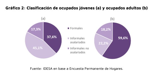 A su vez, los problemas estructurales del mercado laboral argentino, como la elevada informalidad, también se profundizan en los jóvenes. Según datos de la EPH para el tercer trimestre de 2024, el 45,1% de los jóvenes ocupados son asalariados informales, mientras que en los adultos ese porcentaje se reduce a 22,2%. Si además se consideran a los no profesionales que trabajan como cuentapropistas (no asalariados), el porcentaje de jóvenes que trabaja en la informalidad asciende al 62,4%, contra un 40,4% de los adultos ocupados (Gráfico 2).