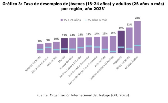 Para hacer una comparación internacional, es necesario reformular el rango etario de los jóvenes para considerar ahora a aquellos que tienen entre 15 y 24 años de edad, tal como lo define la Organización Internacional del Trabajo (OIT). Tomando este nuevo criterio, el desempleo de los jóvenes en Argentina fue de 19,4% en el tercer trimestre de 2024. Este porcentaje contrasta notablemente con la tasa de desempleo juvenil global de 13% en 2023, calculada por la OIT en su informe de “Tendencias Mundiales del Empleo Juvenil 2024”. También es elevada al compararla con los países de la región, ya que el desempleo juvenil fue de 13,6% en América Latina y El Caribe.