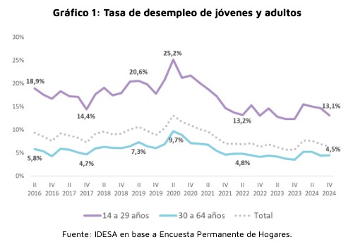 Según datos de la Encuesta Permanente de Hogares (EPH) del último trimestre de 2024, la tasa de desocupación de los jóvenes entre 14 y 29 años de edad fue de 13,1%, mientras que para los adultos entre 30 y 64 años fue de 4,5%. En otras palabras, los jóvenes enfrentan un desempleo que triplica el de los adultos, y la magnitud de esta diferencia se mantiene a lo largo del tiempo (Gráfico 1).