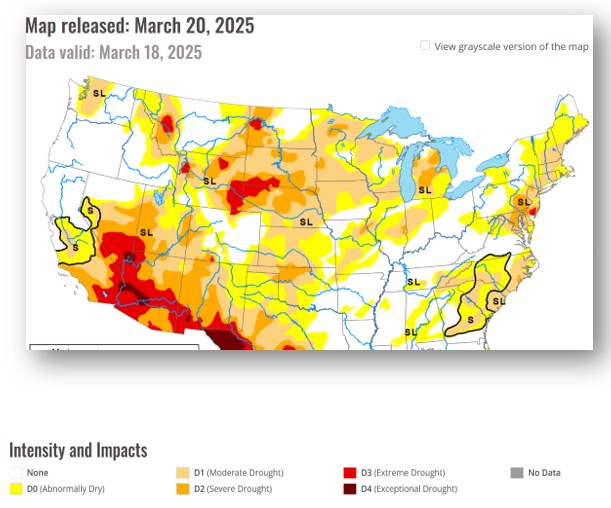 El mapa del USDA del 20 de marzo pasado muestra la sequía al 18 de marzo.