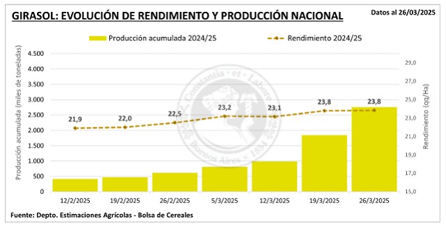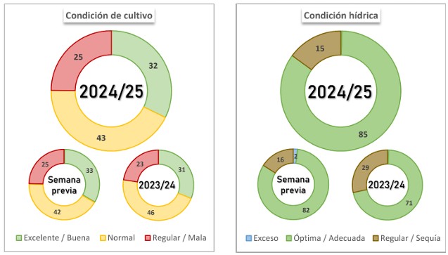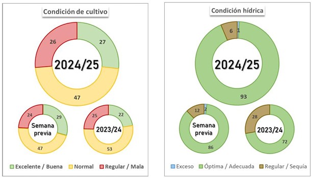 En este contexto, se mantiene la proyección de producción nacional en 49 MTn. En cuanto a girasol, a pesar de las lluvias registradas, la cosecha ha avanzado 19,6 p.p. intersemanales, cubriendo el 58,9 % del área apta. Este avance refleja todavía una demora interanual de -16,1 p.p., pero logró alinearse al avance promedio histórico PAS. Las altas expectativas de rendimiento siguen incentivando la continuidad de la cosecha, incluso en lotes donde las condiciones de piso no son óptimas para el ingreso de maquinaria, con el objetivo de evitar pérdidas adicionales de plantas en pie y problemas de calidad debido al brotado. A pesar de los variados rendimientos registrados (entre 8 y 38 qq/Ha), los promedios regionales continúan superando las medias históricas, lo cual, de mantenerse en las semanas restantes de la cosecha, podría resultar en un nuevo aumento en la proyección de producción.