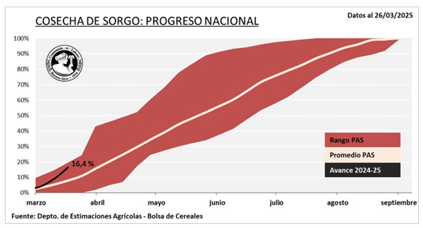 La cosecha de sorgo granífero avanzó 7,6 p.p. en los últimos quince días y alcanza actualmente el 16,4 % del área total nacional. Si bien en varias regiones se están registrando rindes superiores a los inicialmente esperados, la sequía tuvo un fuerte impacto en el NEA y en el norte de Santa Fe, generando importantes mermas productivas. Cabe recordar que aproximadamente el 46,8 % del área sembrada a nivel nacional se concentra en estas zonas, por lo que las proyecciones de producción se vieron significativamente afectadas. En el NEA, se estima una caída del rendimiento del orden del 37 %, con promedios que no superarían los 20 qq/Ha. En el Centro-Norte de Santa Fe, aunque el norte provincial resultó tan afectado como el NEA, algunas áreas del centro lograron mitigar parcialmente las mermas.