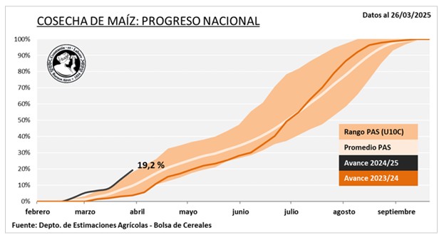 El 50 % de la soja de primera a nivel nacional, ya ha iniciado el período de madurez fisiológica. Las regiones de los Núcleos y Córdoba son las más avanzadas y están próximas a iniciar la cosecha. En tanto, en el Centro-Norte de Córdoba, la recolección ha comenzado de manera tímida con los primeros lotes, esperando cobrar mayor ritmo en los próximos días. El 80 % de la soja de segunda se encuentra entre R4 Y R5. Sobre la región central, más del 80 % de lo implantado presenta una condición de cultivo Normal/Excelente. Bajo este escenario, sostenemos nuestra proyección de producción en 49,6 MTn. La cosecha de maíz continúa a buen ritmo durante los últimos siete días alcanzando el 19,2 % del total nacional, lo que significa un adelanto interanual de 13,2 p.p. Los factores que más explican este adelanto son una mayor proporción de siembra temprana sumado a que algunos planteos finalizaron su ciclo de manera anticipada debido al estrés hídrico sufrido durante el llenado de granos. A nivel nacional, el rendimiento promedio se ubica en 83,9 qq/Ha, destacándose la zona Núcleo Norte con un promedio de 96,4 qq/Ha. En cuanto a los planteos tardíos, la totalidad de los lotes se encuentran desde R3 en adelante, atravesando esta etapa con una buena disponibilidad hídrica. No obstante, las lluvias recientes en el norte agrícola no tendrían un impacto significativo en la condición de los cultivos en esa región.