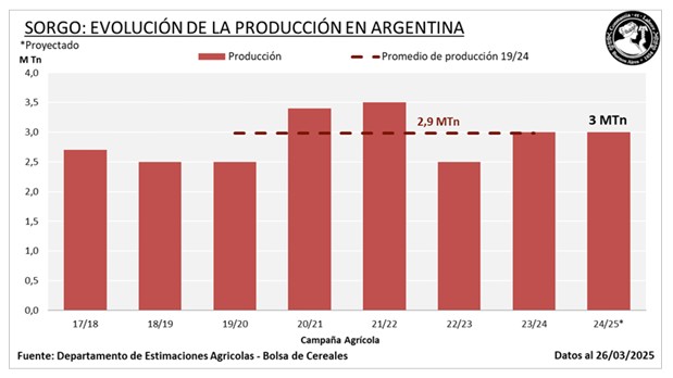 Además, las pérdidas de área asociadas al estrés hídrico también registraron un incremento considerable. Por otro lado, en el Centro-Norte de Córdoba y en la zona núcleo se reportan rindes por encima de lo esperado, aunque, debido a su menor participación en la superficie total, no serían suficientes para compensar las pérdidas registradas en el norte. Bajo este marco, la proyección de producción nacional de sorgo se ajusta a la baja, ubicándose en 3 MTn, lo que representa una reducción del 9,1 % respecto a la estimación previa.