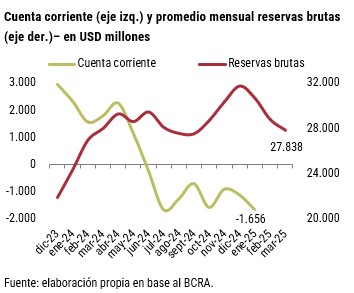 Así, en enero y febrero el superávit comercial alcanzo USD 162 millones (-79% i/a) y USD 227 millones (-83% i/a), incluso al ver el resultado base caja (lo que efectivamente se pagó) la cuenta se tornó negativa. Más en detalle, la cuenta corriente computa no solo el resultado comercial, sino también el intercambio de servicios, incluidos los gastos por turismo en el exterior, las intervenciones en las cotizaciones paralelas y el pago de utilidades y dividendos. La novedad es que el último dato disponible, de enero-25 otorgó el déficit más importante desde junio-23 y la vuelve un dato a seguir pendientes a futuro. De esta forma, teniendo en cuenta los pagos de deuda, las reservas del Banco Central fueron perdiendo robustez desde la segunda mitad del 2024, con altibajos gracias a las exportaciones y al blanqueo de capitales. Al 18/3 las reservas brutas alcanzaron los USD 27.208 millones, dejando a las reservas netas en USD - 4.862 millones .