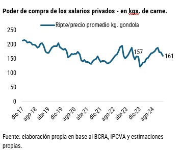 De hecho, en términos reales (versus la inflación) el precio promedio por kg. En góndola terminó 2024 un 17% más barato. La corrección se produce en el marco del mejoramiento del poder adquisitivo en términos de producto, que supera los valores de fines de la administración anterior, y se incrementó 16% en el último año .