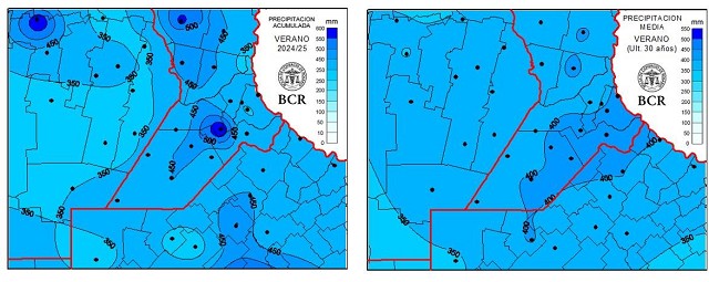 Las precipitaciones medias históricas del verano en la región núcleo suelen estar entre 350 y 450 mm. Este verano 2025 finalizó con un promedio de lluvias de 412 mm. Bigand acumuló 620 mm, superando en un 150% la media histórica de lluvias para la localidad. Colonia Almada marcó 613 mm, o sea, 245 mm más que el promedio histórico. Por otro lado, hay localidades que quedaron por debajo de la media histórica, como Canals que acumuló 251 mm en todo el verano, quedando 100 mm por debajo del promedio y Lincoln que con 290 mm, quedó con 78 mm por debajo de su media.