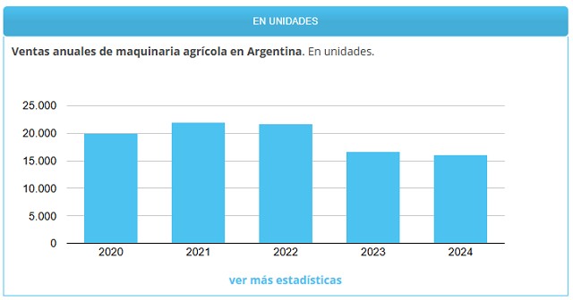 En unidades, las ventas de tractores, cosechadoras, sembradoras e implementos informadas por el INDEC totalizaron 16.103 equipos en 2024, con una caída de -3,7% respecto al año anterior (16.720 unidades). Fue el nivel más bajo de los últimos siete años.