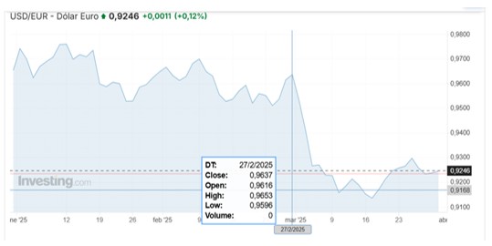 Lo que resulta nuevo es la forma que el dólar está cayendo a resultas de las señales de ralentización del crecimiento en EE.UU. por la incertidumbre sobre la nueva política arancelaria.