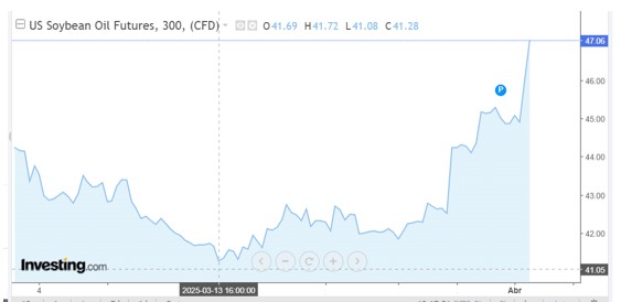 Respecto al aceite, la política arancelaria de EE.UU. es positiva para el aceite de soja, pues el arancel del 25% que grava los bienes importados desde Canadá, dificultarían el ingreso de aceite de canola.