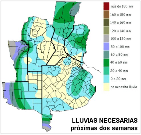 Partiendo de las condiciones actuales de humedad se puede estimar la demanda de precipitaciones para mantener los suelos en niveles adecuados u óptimos durante las próximas dos semanas. No sorprende que la mayor parte de la zona núcleo, LP y BA, tienen una demanda nula o muy baja. Esto también puede considerarse como algo dominante en gran parte del sur de ER. Por otra parte se aprecia un incremento de los requerimientos pluviales sobre el norte santafesino, donde, como mencionamos, las lluvias se han mantenido en niveles bastante por debajo de lo esperado para el mes de marzo.