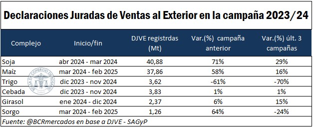 A partir de los registros de Declaraciones Juradas de Ventas al Exterior (DJVE), se observa que del complejo soja se registraron 40,88 Mt, lo que representa 29% por encima del promedio de las últimas tres campañas. El maíz le sigue con 37,86 Mt declaradas, superando en 16% el promedio trianual. En contraste, el complejo trigo mostró una fuerte caída: con solo 3,62 Mt exportadas, las DJVE cayeron 61% respecto al ciclo previo y 70% frente al promedio de las últimas tres campañas. Este bajo volumen responde, en parte, a los efectos de la sequía sobre la producción 2022/23 y la existencia de declaraciones de exportación “rolleadas” desde campañas anteriores.
