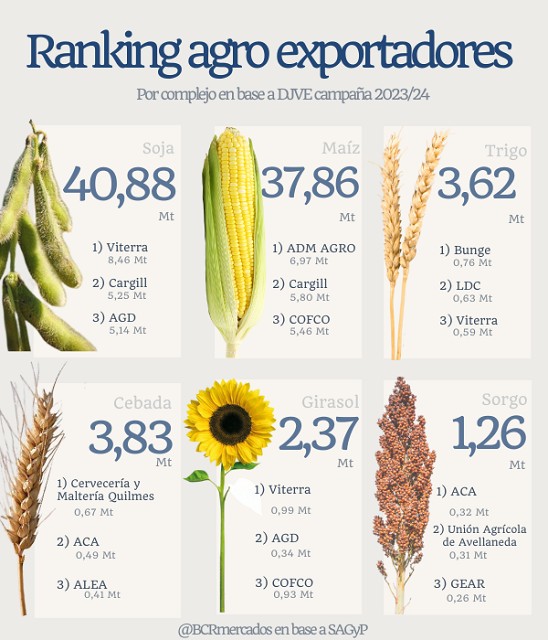 Además de observar los volúmenes totales por campaña, desagregar las DJVE por complejo permite identificar a los principales actores del comercio exterior argentino en cada uno de los cultivos. En la campaña 2023/24, el liderazgo exportador varió según el complejo, con diferentes empresas dominando el mercado de soja, maíz, trigo, cebada, girasol y sorgo.