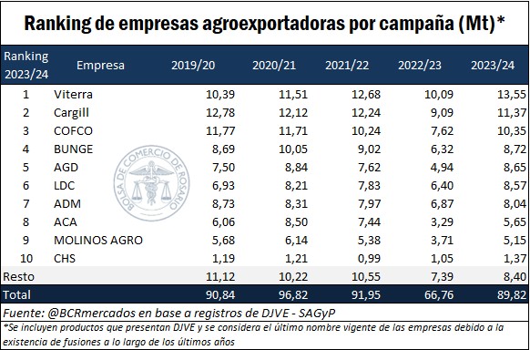 Viterra encabezó el ranking de DJVE por exportaciones agroindustriales con 13,55 millones de toneladas registradas, consolidándose como la principal empresa exportadora del ciclo 2023/24. Le siguió Cargill, con 11,38 Mt, y en tercer lugar se ubicó COFCO, con 10,33 Mt. Estas tres compañías explican cerca del 39% del total anotado en exportaciones de los principales productos agroindustriales del ciclo 2023/24.