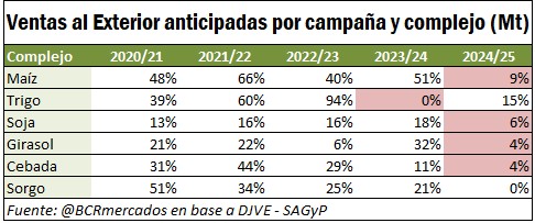 En comparación con las últimas cinco campañas, la proporción de ventas anticipadas para la campaña 2024/25 se encuentra en su nivel más bajo. Mientras que, en últimas campañas, los registros de DJVE anticipadas representaban un porcentaje mayor, en 2024/25 la participación de ventas anticipadas es considerablemente menor. Se destaca que, para el anote “anticipado” de cada producto se contempla el avance en la registración hasta el comienzo efectivo de la campaña que difiere según el producto. Específicamente, el ciclo comercial de trigo/cebada comienza en diciembre, girasol en enero, maíz/sorgo en marzo y soja en abril.