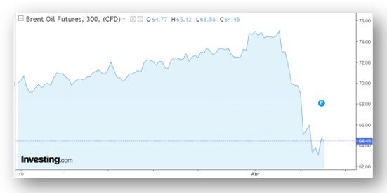 Luego de llegar, en enero, a un pico de USD 82 el barril de petróleo, a partir de marzo empezó a cotizar alrededor USD 70. Y luego del anuncio del aumento de aranceles de EE.UU. bajó a cerca de USD 65