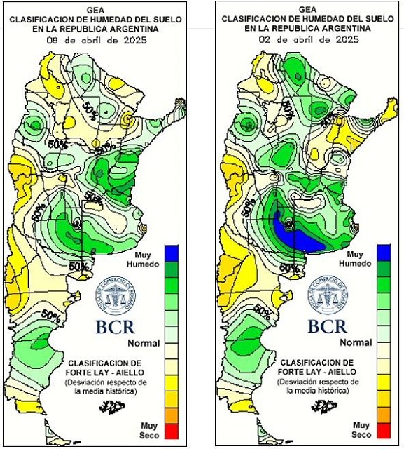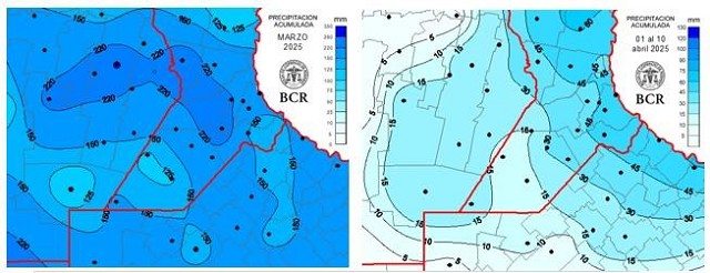 En los primeros diez días del mes, las precipitaciones volvieron a destacarse, especialmente en el norte y este de la región núcleo. Irigoyen acumuló 60 mm, Rosario 55,2 mm y Carlos Pellegrini 52,6 mm. En el norte bonaerense, Baradero y Ramallo también superaron los 50 mm. Estas lluvias se suman a un marzo llovedor, que cerró con un promedio regional de 176 mm, muy por encima de los 100 mm que marca la media histórica. Todas las estaciones de la red GEA/BCR registraron acumulados por encima del promedio, y en siete de ellas incluso se superaron los 250 mm.
