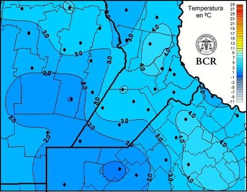 Las mínimas oscilaron entre los 0 y 3°C en el sur de la zona GEA (region nucleo), y entre 4 y 5°C en el centro-norte.