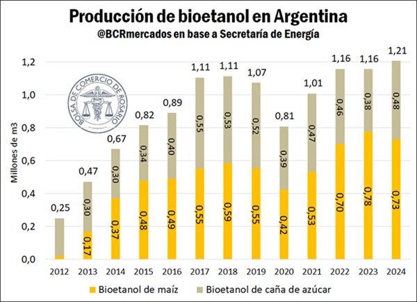 Las 6 plantas de bioetanol a base de maíz y las 11 plantas de bioetanol a base de caña de azúcar produjeron 1,21 millones de metros cúbicos de bioetanol en 2024. De esta manera, en 2024 la producción de etanol rompió récords, creciendo un 4% respecto al 2023 y marcando el mayor volumen de bioetanol del que se tenga registro.