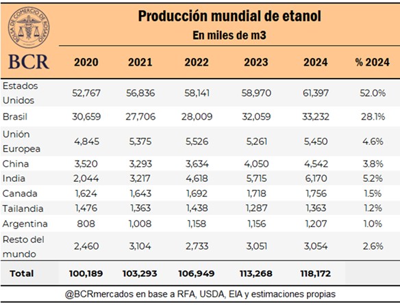 En Brasil se utilizaron más de 325 millones de toneladas de caña de azúcar y 15 millones de toneladas de maíz para producir etanol en 2024. Si bien el volumen de maíz puede parecer recortado en relación al volumen utilizado de caña de azúcar, es importante destacar que ese tonelaje equivale a cerca del 13% de la cosecha brasilera de maíz, industrializado para producción y exportación de etanol. No conforme con ello, se espera que el corte obligatorio de bioetanol en nafta suba al 30% antes de que finalice el primer semestre de 2025 en Brasil. Desde 2016 la tasa de corte se ubica en 27%.