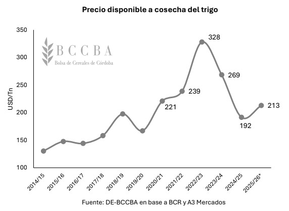 En cuanto al precio del cereal, la posición diciembre 2025 en A3 Mercados se opera en torno alos USD 213 Tn. Este valor, representaría un incremento del 11% del precio a cosecha encomparación al ciclo previo (+21 USD/Tn). En la actualidad, el mercado centra su atención en eldesarrollo del cultivo en el hemisferio norte, el cual dependerá del clima que se presente en lospróximos meses. Por lo cual, se podría observar cierta volatilidad en las cotizaciones del cerealen el corto plazo.