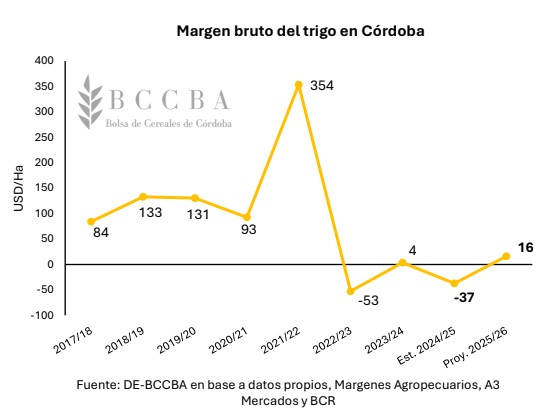 Por otro lado, los márgenes agrícolas continúan en una situación delicada. En base a un planteotécnico promedio a nivel provincial y considerando un rinde medio (25 qq/ha), el margen bruto1proyectado para el ciclo 2025/26 arroja un resultado positivo de USD 16 por hectárea,mejorando respecto a la pérdida de USD 37 por hectárea estimada para el ciclo 2024/25. Sinembargo, es habitual que el cereal sea el antecesor de un cultivo estival. Por lo cual, se estimóel margen bruto y el resultado operativo2 para un planteo de trigo y soja de segunda en Córdoba.