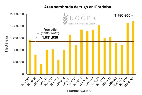 Según el departamento de información agronómica de la Bolsa de Cereales de Córdoba (DIA- BCCBA), el área triguera en la provincia de cara a la campaña 2025/26 sería récord y alcanzaría1.750.600 hectáreas sembradas. Dicha superficie, representaría un incremento del 3% encomparación al ciclo previo (1.700.218 hectáreas) y superaría en un 62% al promedio de lasúltimas campañas (1.081.936 hectáreas).