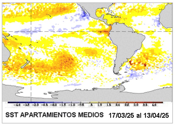 Con el avance del mes de marzo, se ha ido consolidando la neutralidad. La masa de agua más cálida que surge desde Sudamérica se ha movido hacia el centro del Pacifico Ecuatorial y ya la presencia de la anomalía fría es reducida. En promedio, aun se observan unas décimas de grado de enfriamiento. Sin embargo, como hemos observado durante marzo, estas anomalías oceánicas no tienen injerencia sobre lo que sucede en el sudeste de Sudamérica.