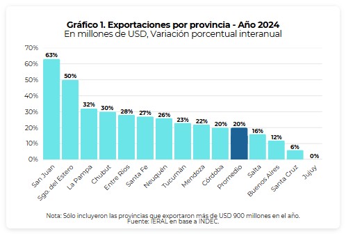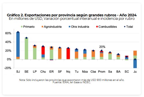 En las otras industrias aparecen San Juan (minería), Chubut (exportaciones de manufacturas de metales), y Mendoza (plásticos).
