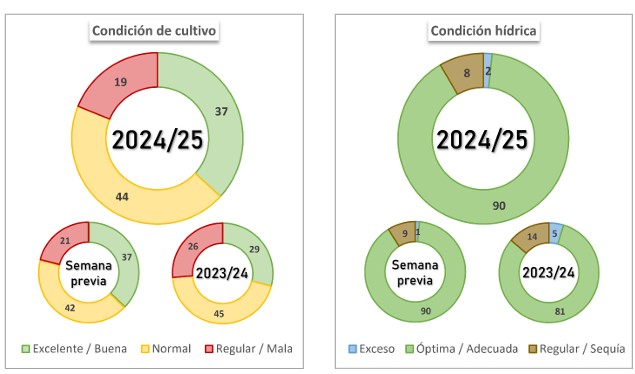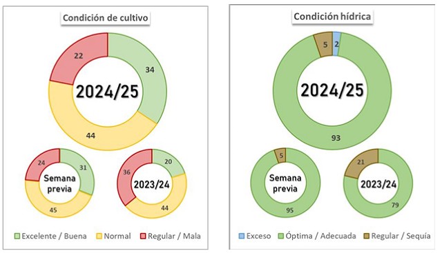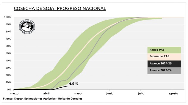 El progreso intersemanal de cosecha fue de 7,3 p.p. y cubre a la fecha el 94,9 % del área apta. El rinde promedio nacional se ubica en 23,4 qq/Ha, manteniendo la actual proyección de producción en 4,5 MTn